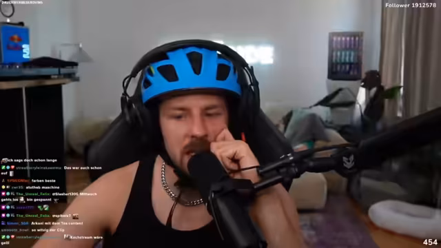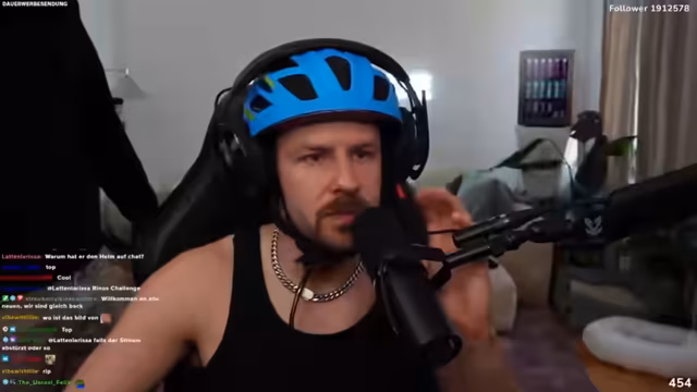 00:00:00Der Stream beginnt mit dem traditionellen Begrüßungsruf 'Wir sind zurück!'. Es folgen übliche Smalltalk-Themen: Termine wie eine Bioarbeit und der Gewinn eines Kinofilm-Gewinnsspiels werden thematisiert. Ein wiederkehrendes Element ist die humorvolle Erwähnung des Helms, der als Symbol für Sicherheit und gleichzeitig als Running Gag dient, auch während der Verhaltenstherapie für den Hund Akani getragen wird.