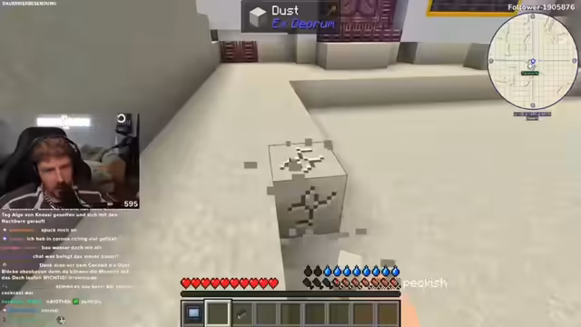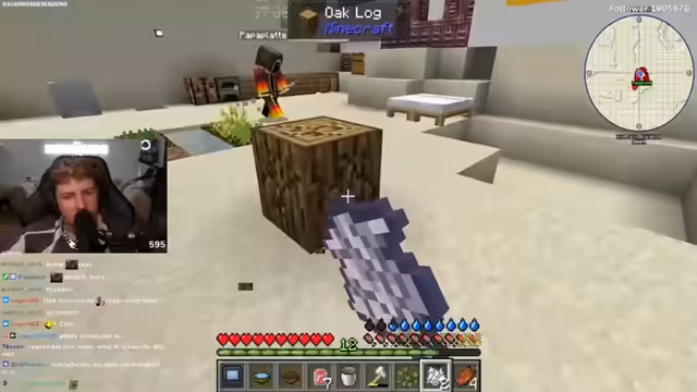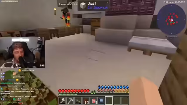 01:44:53Nach der Dokumentation wechselt der Streamer zum Gaming-Inhalt. Er begrüßt seine Zuschauer und den Co-Streamer Kevin für eine neue Folge des 'Minecraft Mega Überleben Projekts'. Ihr Ziel ist es, in der Wüste einen Laboren bauen. Der Stream wirkt von der ernsten Thematik der Schule zu einem lockeren, gelegentlich chaotischen Gameplay mit humorvollen Einlagen und Chat-Interaktionen übergegangen.