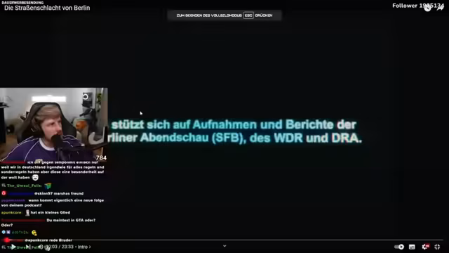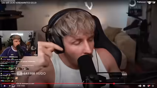 03:43:50Ein unerwarteter Stromausfall unterbricht den Stream und führt zu einer spontanen, chaotischen Situation. Nach der Wiederherstellung der technischen Anlage gibt es eine hitzige Debatte über den Streamer Papa Platte. Zusewerfer werfen ihm vor, durch seinen Stream Zuschauer zu stehlen und zu 'crashen'. Im Gegenzug wirft der Streamer Papa Platte vor, der Offline-Zeit zu profitieren. Die Konfrontation endet mit persönlichen Beleidigungen und der Ankündigung, sich Feinde nahen zu halten, um sie später zu 'stechen'.