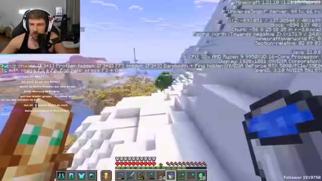 02:38:36Ein unvorhergesehener PC-Crash unterbricht den Spielverlauf und führt zu technischen Schwierigkeiten beim Resource Pack. Der Streamer muss zahlreiche Optionen deaktivieren, um das Spiel wieder zum Laufen zu bringen. Trotz dieses Rückschlags wird der Fortschritt im Minecraft-Bau vorangetrieben, wobei die Planung für einen Berg und ein Bootshaus thematisiert wird und ein grundlegender Richtungswechsel im Bauplan diskutiert wird.