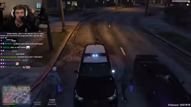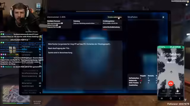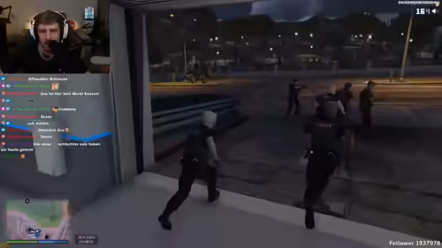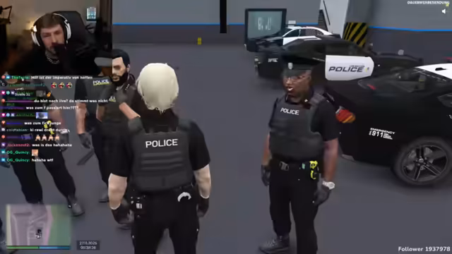 02:31:36Im Zuge des Rollenspiels übernimmt der Streamer die Rolle eines Polizisten, der mit einem Partner im Streifendienst unterwegs ist. Die Situation eskaliert, als sie in der Innenstadt auf eine Gruppe von Jugendlichen treffen, die lautstark sind und sich verdächtig verhalten. Der Streamer interpretiert die Situation als potenzielle Straftat und veranlasst die Festnahme der Afroamerikaner und Mexikaner, was im Chat zu Diskussionen über mögliches Racial Profiling führt. Ein Dispatcher meldet später, dass eine Streife am Würfelpark überfallen wurde.