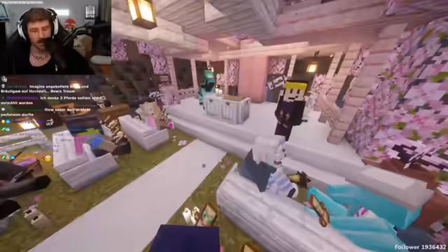 02:40:33Der Stream verlagert sich zu einer geplanten Hochzeitszeremonie für zwei Pferde. Ein strenger Dresscode in Pink vorgegeben. Die Zeremonie wird durch Chaos gestört, durchdrungen von Absurditäten wie der Erwähnung von 'Zwangsheirat', 'BBL' und der improvisierten Vorführung eines romantischen Liedes mit einem alten Schatz als Symbol, was den surreal-humorvollen Höhepunkt des Events darstellt.