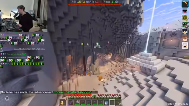 00:50:58Der Streamer präsentiert stolz die Fortschritte beim Bau seiner Höhlen-Base. Er hat den ganzen Vormittag damit verbracht, die Höhle zu terraformen und sie zu erweitern. Besonders hervorzuheben ist der Bau einer Schlucht und einer Säule, die eine kleine Konkave nach oben bildet. Auch ein Sub-Raum, der von Fabo angelegt wurde, wird gezeigt, in dem alle Subs von Fabo aufgeschrieben sind. Ein weiteres Highlight ist der Bau eines Brunnens mit einer Drachenhöhle, der hoffentlich bald oxidiert und einen grünen Drachen darstellen wird. Die Railing oben an der Höhle wurde ebenfalls fertiggestellt und sieht nun sehr beeindruckend aus. Der Streamer hat zudem weitere Terraforming-Arbeiten durchgeführt und kleine "Jump Pots" mit Dreizacken platziert, um sich bei Nicht-Regenwetter schnell in der Base bewegen zu können. Er plant, einen Elytra-Launcher zu bauen, um schnell nach oben zu gelangen, da Raketen noch nicht funktionieren.