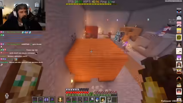 05:04:45Es wird ein Community-Event in der Base veranstaltet, bei dem jeder Teilnehmer die Möglichkeit erhält, ein eigenes Haus zu bauen. Dieses Projekt soll als gemeinsames Andenken an Craft-Attack dienen, damit am Ende des Jahres auf ein erfolgreiches Event zurückgeblickt werden kann. Ein Teilnehmer schlägt humorvoll vor, ein Haus zu bauen, ohne dass der Streamer das Design kritisieren darf, und schließt scherzhaft aus, ein Hakenkreuz oder ein Pixel-Art von Dehners Profilbild mit anzübringen. Die Teilnehmer werden gebeten, sich für das Event anzustellen, wobei eine humorvolle Anspielung auf das Anstellen im Phantasialand gemacht wird. Es gibt auch eine Diskussion über die Altersgrenze von 18 Jahren und das Verhalten der Teilnehmer, die sich drängeln oder andere schlagen, was ebenfalls mit dem Phantasialand verglichen wird.