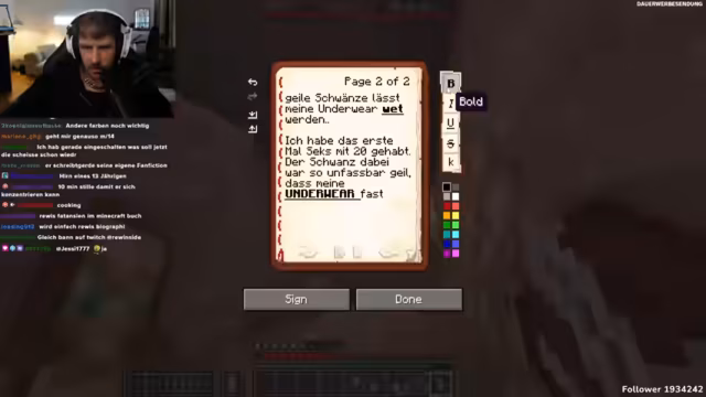 05:47:08Nach der Auktion kommt Herr Bolzen, der Vermieter, um die Miete einzufordern. Es entwickelt sich ein humorvoller Streit, bei dem der Streamer und Alphastein versuchen, die Zahlung zu vermeiden. Sie bieten Herrn Bolzen an, ein Buch zu schreiben, um die Miete zu begleichen. Herr Bolzen gibt ihnen eine Stunde Zeit, das Buch fertigzustellen. Das Buchprojekt beginnt mit dem Titel "Between Dry and Wet Underwear" und wird humorvoll mit anzüglichen Kapiteln wie "Die geile Verfickung" und "Andreas' zugenähte Vorhaut" gefüllt. Alphastein zieht sich aus dem Projekt zurück, da er nicht mit dem Inhalt einverstanden ist. Das Buch wird schließlich fertiggestellt und Herrn Bolzen präsentiert.