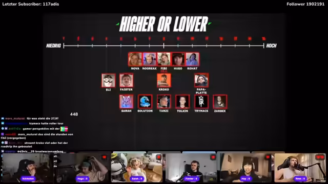 04:16:07Die Teilnehmer spielen ein weiteres Runde, bei der sie anhand ihrer Streaming-Aktivität sortiert werden. Die Kategorie lautet 'Twitch Stream diesen Monat'. Jeder Teilnehmer muss einschätzen, wo ein Streamer im Verhältnis zu anderen einzuordnen ist. Das Format sorgt für viel Spekulation und Diskussion über die Produktivität der Streamer.