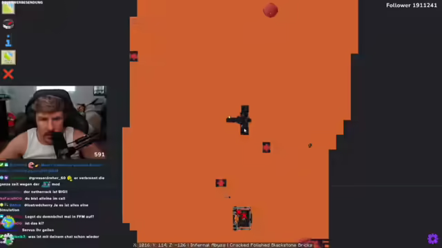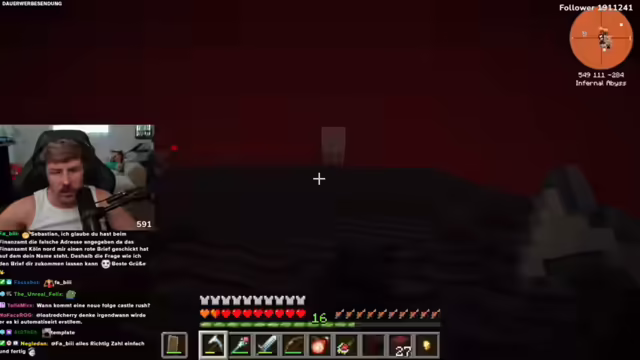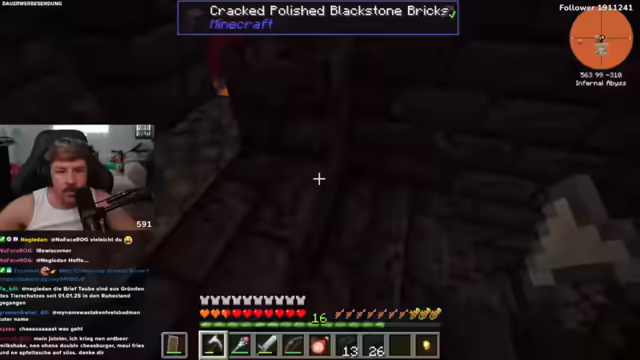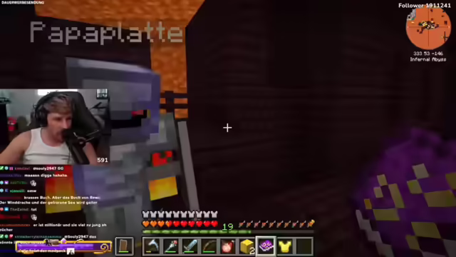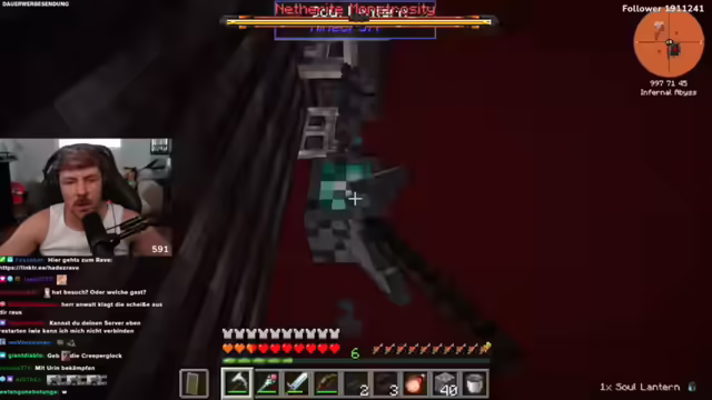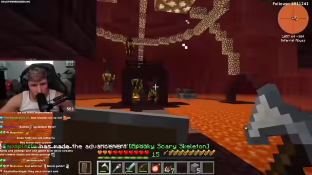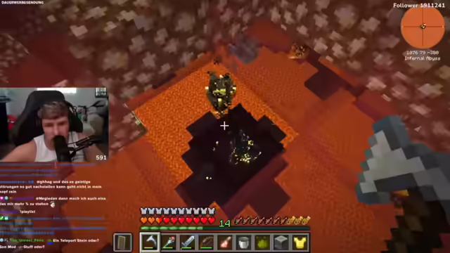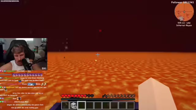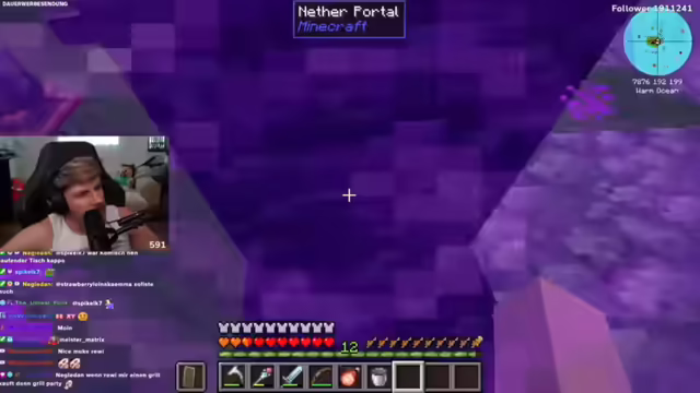 03:08:19Es wird festgestellt, dass ein Spieler gestorben ist und beim Portal abgeholt werden muss. Der gestorbene Spieler wird als kackendumm bezeichnet, weil er im Nether gestorben ist. Der andere Spieler hasst es, das Boot zu bringen, tut es aber. Es wird angeboten, dem Retter einen zu blasen. Der gestorbene Spieler befindet sich unterhalb des Portals und wird abgeholt. Es wird vor dem Drachenlord gewarnt. Es wird überlegt, wie man das Netherite-Monster töten kann. Ein Spieler ist in der Nähe von Lava-Feldern gestorben. Es wird über Soundprobleme geklagt. Der gestorbene Spieler wird zum Sterbeort gebracht, nachdem der Weg freigeräumt wurde. Es wird überlegt, ob man überhaupt Fortschritte macht oder nur Quatsch macht. Es wird festgestellt, dass man in der Bastion ein Upgrade-Template gefunden hat und neue Rüstungen erhalten hat. Ein Spieler hat seine Päckchen vergessen. Es wird weitergefahren und ein Crossbow gefunden. Es wird zurück zum Spawn gefahren, da dort etwas Heftiges sein soll. Es wird vermutet, dass es sich um eine Festung handelt. Es wird diskutiert, wie man mit Leuten umgeht, die Witze nicht verstehen. Es wird zu einer Insel gefahren, die aber als uninteressant eingestuft wird. Es werden Bläsrotts gesichtet. Die Festung befindet sich unter Lava und wird als cursed bezeichnet. Es wird beschlossen, die Festung zu erkunden, obwohl sie gefährlich erscheint. Es wird nach einer Kiste gesucht.