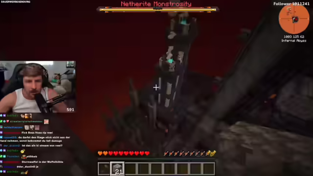 01:56:29Es wird beschlossen, den Bosskampf zu versuchen, aber der Streamer stirbt schnell. Der Boss wird als "Bürgermeister von Duisburg" bezeichnet. Während des Bosskampfes wird Gitarrenmusik gespielt. Der Streamer sucht nach einem neuen Team. Es wird versucht, den Boss mit einer Laterne zu erreichen, aber das gestaltet sich schwierig. Ein schlechter Start in den Kampf wird festgestellt. Es wird überlegt, das Bett von Team Blau zu zerstören. Der Streamer überlebt und kehrt zurück, aber der Kampf ist immer noch schwierig. Es wird festgestellt, dass der Bosskampf "unbefriedigend" ist und die Musik abrupt endet. Es wird versucht, in Lava zu schwimmen. Der Streamer ärgert sich über einen Gag-Ship und einen Gast im Stream. Es wird überlegt, den Boss mit einer Gatling-Gun zu beschießen, aber er regeneriert sich. Es wird versucht, Wasser im Nether zu platzieren, um den Boss zu bekämpfen. Der Gast wird getötet, aber die Platzierung der Blöcke ist aufgrund eines Modpacks schwierig.