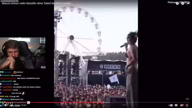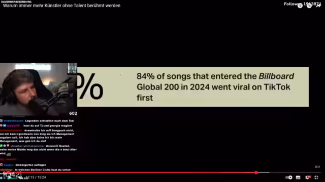 04:02:19Der Streamer reflektiert über seinen eigenen Werdegang als Musiker, der durch zufällig erstellte, virale Songs wie einen Fawn-Song vor Corona grundlegend verändert wurde. Er stellt die Frage, ob es heutzutage in der Musikindustrie überhaupt noch möglich ist, ohne TikTok-Viralität durchzukommen, und kritisiert, dass viele Künstler mit dem System der gefakten Streams und künstlich aufgebauten Hypes konfrontiert sind, was seiner Meinung nach zu einer unechten und seelenlosen Musiklandschaft führt.