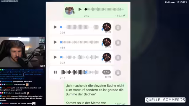 01:34:52Der Streamer schildert schockierende Aussagen seiner Ex-Partnerin, in denen sie offenbarte, dass sie drittensiebensiebensiebensiebensiebensiebensiebensiebensiebensiebenerfolgreiche YouTuber auspressen möchte, um mehr Macht zu erlangen. Er zitiert sie mit den Worten, sie habe Erfolg, Geld und vor allem Macht über Menschen immer gewollt und würde alles dafür tun. Er beschreibt dieses Verhalten als abgefahren, Mafiähnlich und als einen Game of Thrones-Zug, um Angst zu erzeugen und Moves anderer Creator zu neutralisieren, was er als extrem manipulativ und toxisch bezeichnet.