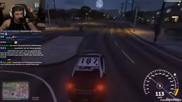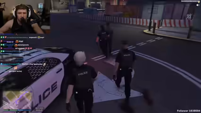 04:27:30Der Hauptfokus des Streams verlagert sich auf ein intensives und chaotisches Rollenspiel (RP) im Stil eines Grand Theft Auto Servers. Der Streamer und seine Mitspieler agieren als fiktive Polizisten in einer fiktiven Stadt. Die Situationen sind absurd und komplex, inklusive Verfolgungsjagden, unkoordinierter Kommunikation über den Funk, administrativer Unfähigkeit und Konfrontationen mit verdächtigen Personen wie Go-Kart-Fahrern. Der Streamer mimt dabei verschiedene Rollen, unter anderem einen erfahrenen Polizisten, der einem unerfahrenen Azubi die Grundlagen beibringt, was zu vielen humorvollen und irritierenden Interaktionen führt.