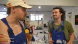 01:37:58Nach Abschluss der Montage wird das Tandam-Fahrrad erstmals gefahren. Zunächst wird es schiebend aus der Werkstatt in den Hof verlegt, um dann dort eine erste kurze Runde zu drehen. Der Testlauf ist erfolgreich, das Fahrrad fährt und ist stabil. Hugo und Mathis testen das Gefährt und berichten von einer leichten, aber beherrschbaren Wackeligkeit. Hugo erwähnt ein kleines Problem: Wenn man den Fuß am Pedal zu weit hinten platzieren, kann man sich in die Hacke beißen. Trotzdem ist er von der Funktion des Fahrrads beeindruckt und berauscht.