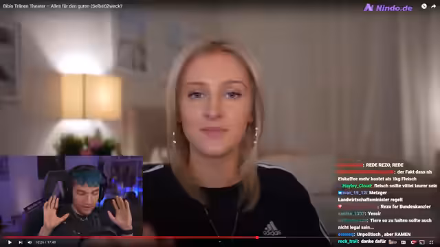 01:43:45In seinem Fazit bewertet der Streamer Bibi Aktion als zwiespältig. Einerseits könne man argumentieren, dass sie durch die hohe Aufmerksamkeit, die sie generiert hat, zum Thema beigetragen hat. Andererseits sei durch die übertriebene Inszenierung die Message verzerrt worden und viele hätten sich über sie lustig gemacht. Es zeige sich ein Dilemma der Influencer-Kultur: Man muss sich inszenieren, um gehört zu werden, aber das verfälscht die Authentizität und das Kernanliegen.
