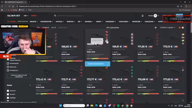 01:50:14Es entsteht ein starkes Interesse am Kauf von Skins für Counter-Strike. Der Streamer erklärt, dass er nur dann aktiv spielt, wenn er in Skins investiert und betont, die hohe Summe von 2000 Euro wäre für ihn denkbar. Gemeinsam mit dem Chat wird über Händler wie Skinport und Skin Baron diskutiert. Der Streamer startet einen Einkaufsstream und beginnt mit der Auswahl von Waffen und Messern, wobei ein的风格 auf farbenfrohe und auffällige Items gelegt wird.