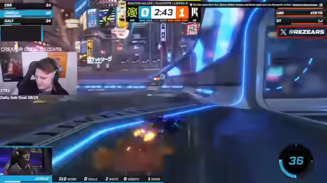 00:11:23Während einer längeren Pause der offiziellen Übertragung, nutzt der Streamer die Zeit für ein 1-gegen-1-Rocket-League-Spiel gegen einen Chat-User namens Ernst. Das Spiel dient als interaktive Ablenkung für das Publikum. Anschließend wird die Rückkehr zum offiziellen englischen Cast angekündigt, der mit dem Kanal 'Raketenliga Live' kooperiert wird.