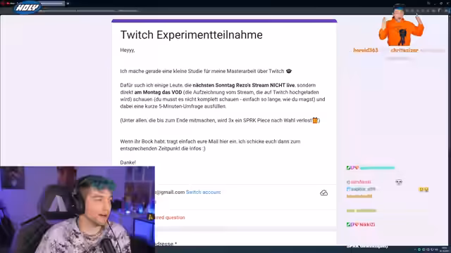 01:22:13Rezo wechselt das Thema und kündigt ein wissenschaftliches Experiment an, bei dem das Team von Team rezo die Hilfe des Publikums benötigt. Er erklärt, dass es für eine Masterarbeit von IMA aus dem Team geht. Zuschauer werden gebeten, an einem bestimmten Sonntag den Stream nicht live, sondern als Aufzeichnung (VOD) zu schauen und danach eine fünfminütige Umfrage auszufüllen. Als Anreiz werden Gewinne ausgelost, die aus einem Spark Piece bestehen.
