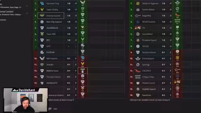 00:03:16Der Stream beginnt mit dem Willkommen der Zuschauer und dem Hinweis auf die Anzeige beider Gruppen des Swiss Stage. Der Streamer blickt auf die bereits abgeschlossenen Spiele des Turniers, darunter Siege von Riccardo und Ivan sowie Scream. Es werden die Ergebnisse von FN gegen Wooka eSports, GameWord gegen MD und Wild gegen Dreifach Reset genannt. Auch die Niederlage von Herford FC gegen Gentleman und die Siege von BSK und GKE Sports werden kurz erläutert.