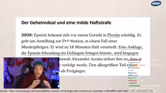 01:47:20Der Stream wechselt zum nächsten Video von Sascha über den Jeffrey Epstein-Skandal. Sascha stellt das Thema als komplex und belastend dar und betont, dass sie bewusst keine detaillierten Beschreibungen der Taten liefern wird, um Opfer nicht zu retraumatisieren. Sie gibt einen Überblick über Epsteins sozialen Aufstieg und seine Verbindungen zur globalen Elite, einschließlich Prominenter wie Donald Trump und Bill Clinton, und erwähnt seine Privatinsel 'Little St. James'.