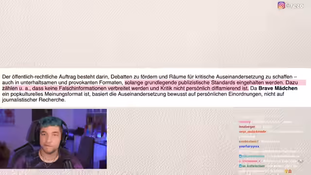 00:18:44Rezo beginnt mit der Analyse des Funk-Podcasts 'Brave Mädchen', den er als tiefgründig und wenig bildungsrelevant kritisiert. Er zitikt Aussagen der Podcasterinnen über sexuelle Erfahrungen und Konfrontationen und stellt deren Content als fremdschamerregend und Ragebait dar. Er kritisiert besonders die Ankündigung des Podcasts als 'Bildungsauftrag' des öffentlich-rechtlichen Senders, während er den Inhalt als reine Unterhaltung ohne Mehrwert ansieht und den provokanten Ton gegenüber Männern thematisiert.