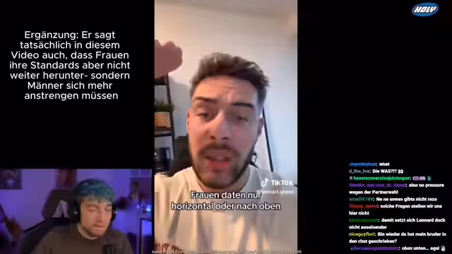 00:20:00Der Stream reagiert im Anschluss auf ein TikTok-Video des Fitness-Influencers Lennart Kleber. Dieser adressiert darin die sogenannte 'Male Loneliness Epidemic' und stellt die These auf, dass Frauen ihn nicht als 'richtigen Mann' wahrnehmen, sondern als feminineren Typen, weshalb sie sich in seiner Gegenwart sicher fühlen, aber nicht angezogen. Der Streamer diskutiert diese Aussagen ausgiebig, bleibt verwirrt und kritisiert den logischen Aufbau. Er thematisiert Lennarts Behauptung, trotz attraktivem Aussehen und sozialem Status 'nahezu null Nachfrage' zu haben, und setzt diese in einen Kontext mit anderen Aussagen wie der Wichtigkeit von Selbstbewusstsein oder einer Beziehung zu einer als 'attraktiver' wahrgenommenen Partnerin. Der Streamer kommt zu dem Schluss, dass die Argumentationskette schwach und selbstentlarvend wirkt und dass bestimmte Punkte der Vorwurf der Eigenwerbung oder des Selbstmitleids nahelegen. Die Auseinandersetzung endet mit einer kritischen Reflexion über gesellschaftliche Dating-Dynamiken.