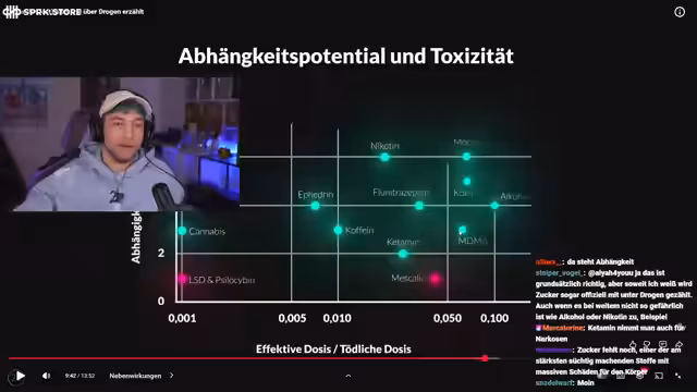 02:37:00Der Streamer thematisiert die Eröffnung des Oktoberfests und die Menschenmassen, die sich bereits in den frühen Morgenstunden vor den Toren versammeln. Er drückt sein Unverständnis für diese Faszination aus und bezweifelt, dass ein Besuch seine Meinung ändern würde. Im weiteren Verlauf des Videos wird das Oktoberfest als 'größtes Drogenfest der Welt' bezeichnet, was den Streamer dazu veranlasst, eine ausführliche Erklärung über Alkohol als Droge zu geben. Er betont, dass Alkohol eine harte und zerstörerische Droge sei, auch wenn sie legal ist. Er plädiert dafür, die gleiche Terminologie für legale und illegale Drogen zu verwenden, um die gesellschaftliche Doppelmoral zu verdeutlichen. Eine Grafik von Dr. Watson wird herangezogen, um das Abhängigkeitspotenzial und das Verhältnis von effektiver zu tödlicher Dosis verschiedener Substanzen zu veranschaulichen, wobei Alkohol als eine der gefährlicheren Drogen hervorgehoben wird.