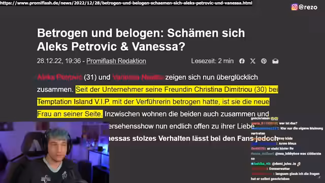 00:15:24Rezo leitet über zu dem Hauptthema des Streams: Reactions auf Videos. Das erste Video, das er sich ansieht, trägt den Titel „Respektlos und herabwürdigend: Alex Petrovics ekelhaftes Verhalten bei RTL – Der momentan schlimmste Reality-Star“. Es geht um Alex Petrovic, der in Reality-TV-Formaten wie 'Temptation Island' und 'Sommerhaus der Stars' durch toxisches Verhalten aufgefallen ist, insbesondere durch das Bespucken von Frauen. Rezo zeigt sich schockiert über Petrovics Handlungen und dessen traditionelles, maskulines Rollenbild, das er in seinen Beziehungen zu Frauen vertritt. Er kritisiert Petrovics Bedürfnis nach ständiger Bestätigung seiner Männlichkeit und seine Ansicht, dass Frauen sich ihm unterordnen sollten. Rezo kommentiert die problematischen Aussagen und Verhaltensweisen von Alex Petrovic, die im Video gezeigt werden, und hebt die Widersprüchlichkeiten und die Toxizität seines Auftretens hervor.