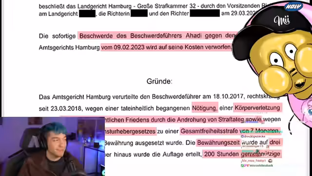 00:53:08Der Stream analysiert die Bewährung von ApoRed im Detail. Es wird die Argumentation von ApoRed besprochen, die besagt, dass sein gefälschter Impfpass nicht während der Bewährungszeit begangen wurde und er daher ein Opfer der Justiz sei. Rezo stellt dieser Darstellung den tatsächlichen Gerichtsbeschluss gegenüber, der zeigt, dass ApoRed die Bewährung wegen eines versuchten Betruges bereits 2020 um ein Jahr verlängert bekommen hatte. Der gefälschte Impfpass, der Urkundenfälschung darstellt, war somit eine weitere Straftat in der laufenden Bewährungszeit, die zum Widerruf führte.