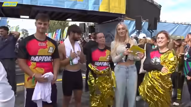 03:09:59Die ersten Teams erreichen das Ziel und werden von Nova interviewt. Die Frogs als erstes im Ziel berichten über ihre Strategie und die größten Herausforderungen. Auch andere Teams wie die Sharks, Raptors und Dragons erreichen schließlich das Ziel, teilweise mit blutigen Verletzungen und Durchnässung. Immer wieder werden die Leistungen der Teams anerkannt und die grosse Anstrengung thematisiert. Nachdem alle Teams durch sind, folgt die offizielle Siegerehrung.