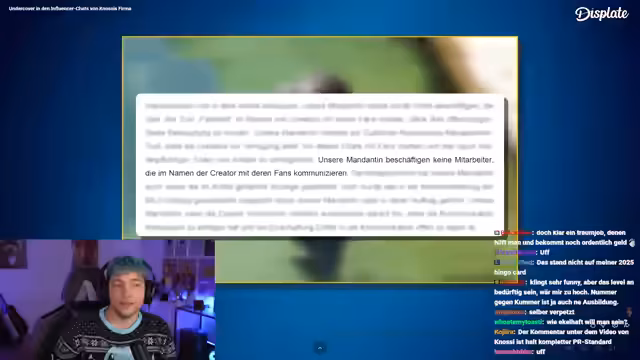 02:59:36Der Stream befasst sich mit der mutmaßlichen unlauteren Geschäftspraxis der Plattform Fanblast und deren Kooperation mit Agenturen wie der Oasis Agency. Es werden Chats aus einer WhatsApp-Gruppe vorgestellt, in denen angeblich Fanblast-Mitarbeiter über das Vortäuschen von Kontakten zu Influencern und das Ausnutzen von Fans für Geld sprachen. Eine Investigativ-Recherche, die einen Journalisten als Undercover-Bewerber bei der Oasis Agency einschleuste, soll die enge Verbindung zur Firma Fanblast belegen. Der Geschäftsführer der Oasis Agency gab an, im selben Büro wie Fanblast zu sitzen und finanziell vom Konzern Fandas gedeckt zu sein, was stark auf eine Inhouse-Agentur hindeutet.