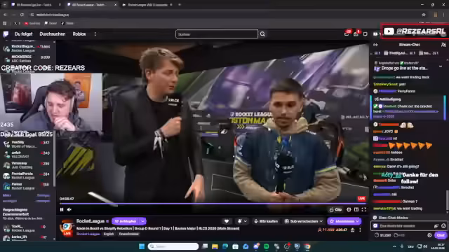 04:46:08Der Streamer erinnert seine Zuschauer daran, wie sie an Drops für Rocket League kommen können. Er betont die Notwendigkeit, den eigenen Rocket League-Account mit Twitch zu verknüpfen, und erklärt die Bedingungen dafür. Zusätzlich wirbt er für den offiziellen deutschen RLCS-Stream auf Twitch und bittet die Community, diesem zu folgen, um die Reichweite der deutschen Szene zu erhöhen und ein offizielles Casting zu unterstützen.