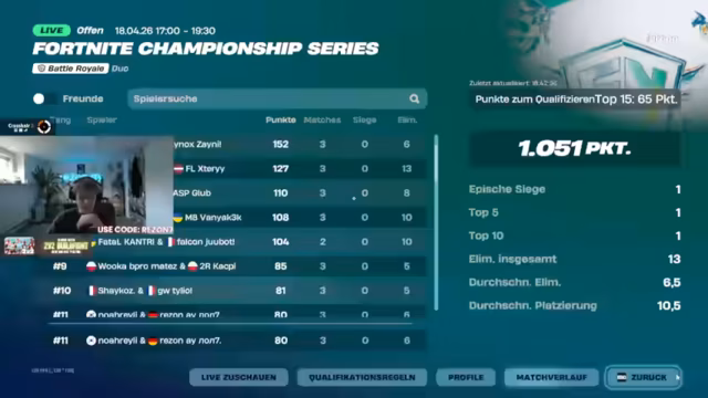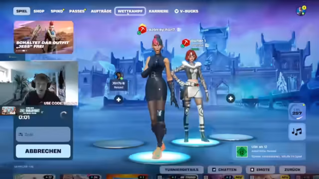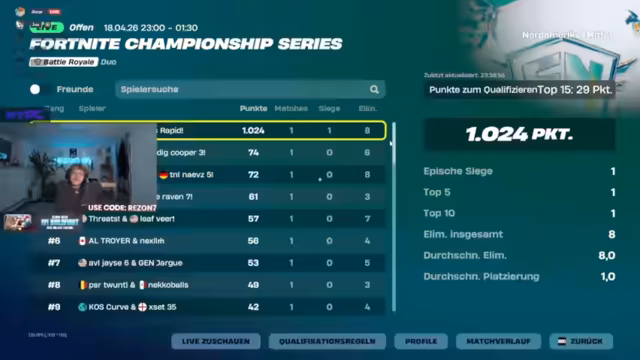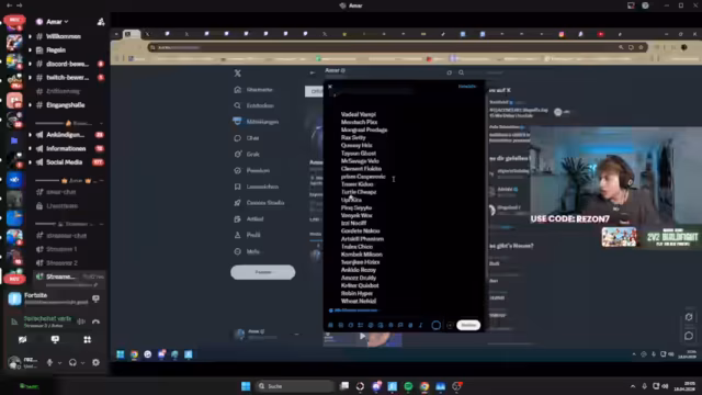 00:00:16Der Livestream startet um 16:47 Uhr mit dem FNCS HEAT 2-Spiel. Streamer rezonfn ist bereits im Spiel und befindet sich in einem Heat. Der Stream interagiert mit Zuschauern wie Gaboi und Felix, während das Spiel beginnt. Es gibt Diskussionen über das Spiel und mögliche Strategien. Der Streamer befindet sich mit Teamkollegen im Spiel und plant, bestimmte Areas zu looten und zu strategisieren.