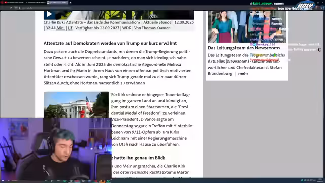 00:12:34Rezo kündigt an, im Stream über Charlie Kirk zu sprechen und hat sich dazu Notizen gemacht. Er plant, ein Video von Simplicissimus über Charlie Kirk anzusehen und seine eigenen Anmerkungen und Einordnungen hinzuzufügen, da er den Bedarf sieht, über dieses Thema zu diskutieren. Nach der Besprechung von Charlie Kirk soll Lisas Feed betrachtet werden. Er betont, dass er sich Notizen gemacht hat, um einige Aspekte zu vertiefen, die in dem Simplicissimus-Video möglicherweise nicht ausreichend behandelt werden. Rezo erklärt, dass er das Video als Ausgangspunkt nutzen wird, um dann seine eigenen Gedanken und Analysen einzubringen. Er hat den Eindruck, dass es ein großes Interesse an einer Auseinandersetzung mit dem Thema Charlie Kirk gibt, was ihn dazu motiviert hat, es im Stream zu behandeln. Nach der Diskussion über Charlie Kirk wird er sich dann Lisas Feed widmen.