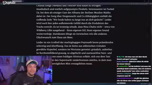 03:05:04Eine Rezension des neuen Albums von Nina Chuba wird kritisiert, da die Rezensentin, Juliane, dem Album vorwirft, grässlich zu sein und die Künstlerin zu sehr Charli XCX und Hyperpop nachzuahmen. Es wird bemängelt, dass Juliane keinen Bezug zur aktuellen Musikszene habe und ihre Kritik unbegründet sei. Insbesondere wird kritisiert, dass Juliane die emotionalen Songs von Nina Chuba als 'kaum zu ertragen' bezeichnet und behauptet, deutsche Emo-Treller von Pop-Rapperinnen seien 'das große Ding', ohne dies zu belegen. Der Streamer betont, dass es in Ordnung sei, wenn Juliane die Musik nicht mag, aber dass ihre Rezension unfair und unprofessionell sei. Er kritisiert auch Julianes Aussage, dass marktgängige Popmusik 'präzedenzlos schrottig und überflüssig' sei, und wirft ihr vor, verbittert zu sein und sich einen anderen Job suchen zu sollen. Abschließend wird kritisiert, dass Juliane die Hörer für das Problem hält, weil sie die Musik nicht kritisch genug bewerten.