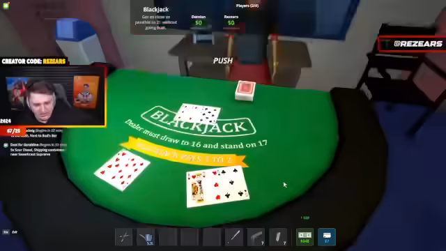 04:50:06Der Streamer besucht ein Casino und versucht sein Glück beim Blackjack. Er setzt viel Geld ein und verliert fast alles, als er eine 15 gegen eine 5 des Dealers stehen lässt. Der Dealer bekommt eine 21 und gewinnt. Der Streamer ärgert sich über den Verlust, aber bleibt unbeeindruckt und beschließt, wieder zu verkaufen, um das Geld zurückzubekommen.