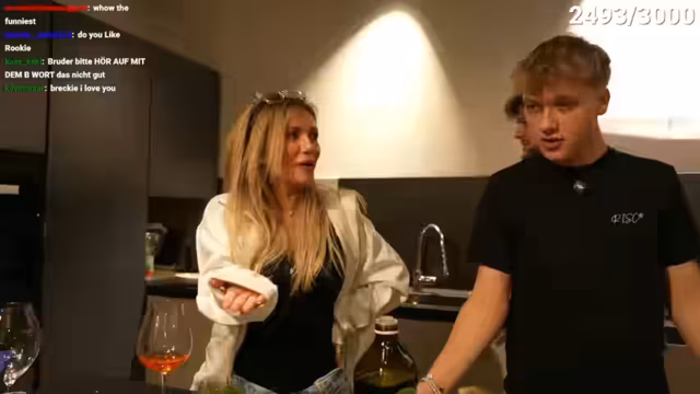 00:15:30Die Kochsession beginnt mit der Zubereitung von Bruschetta. Dabei stellt sich schnell heraus, dass beide Streamer kaum Kocherfahrung haben und grundlegende Techniken, wie das Zwiebeln schneiden, ihnen Schwierigkeiten bereiten. Die Kommunikation zwischen Rezon und Breckie ist von Unsicherheit und gelegentlichem Chaos geprägt, durch das sie sich gegenseitig unterbrechen. Dennoch besteht Breckie darauf, weiterzumachen, während Samantha gelegentlich assistiert. Der Streamer Ben-Louis wird angerufen, was als positiv überraschend und unterhaltsam empfunden wird. Währenddessen steigt die Zuschauerzahl auf über 50.000, was für beide beeindruckend ist.