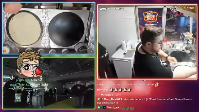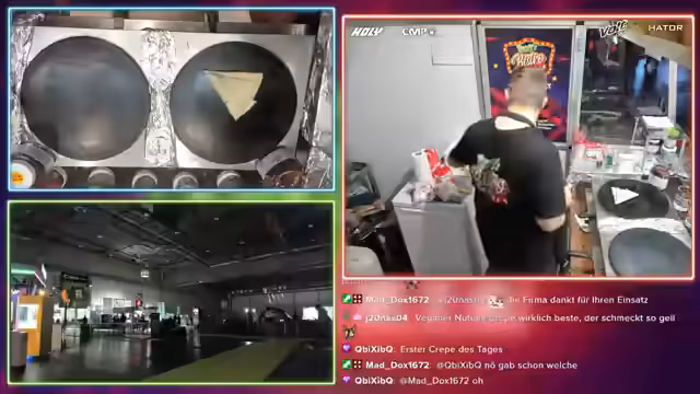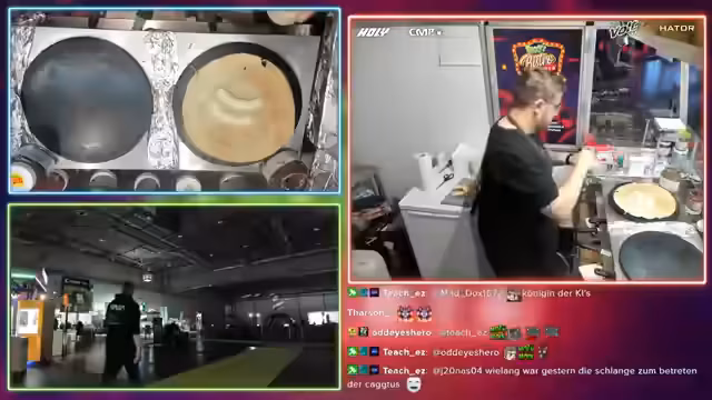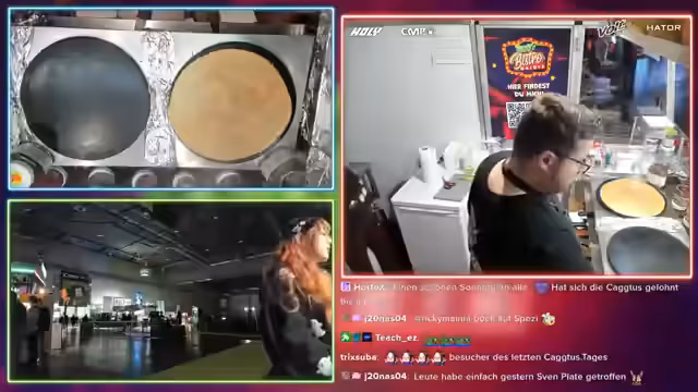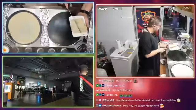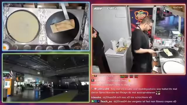 00:10:10Der Streamer interagiert intensiv mit den Besuchern der Messe, fragt nach ihren Wünschen und bereitet die Crêpes individuell zu. Er bietet verschiedene Toppings an wie Nutella, Banane, Joghurt und Käse. Währenddessen wird er von Mitarbeitern und auch in anderen Sprachen angesprochen, was die internationale Ausrichtung der Veranstaltung zeigt.