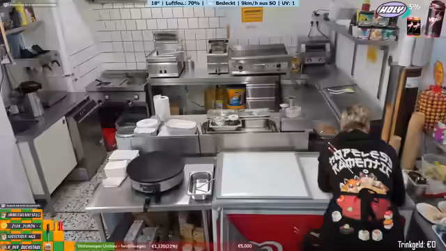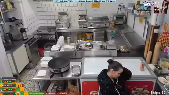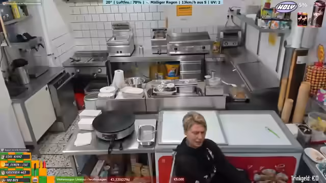 04:45:09Während der Mittagspause bereitet der Streamer sich selbst ein Crepe zu, da heute wenig los ist. Er nutzt die Zeit, um mit den Zuschauern zu reden und über verschiedene Themen zu sprechen, darunter sein neues Hobby - das Englischlernen mit Kopfhörern. Auch seine Haare werden thematisiert - er hat die Sommer im Freibad immer mit pinken Haaren verbracht, ist aber wieder blond. Er wirkt trotz der langen Schicht und des schlechten Wetters noch motiviert.