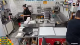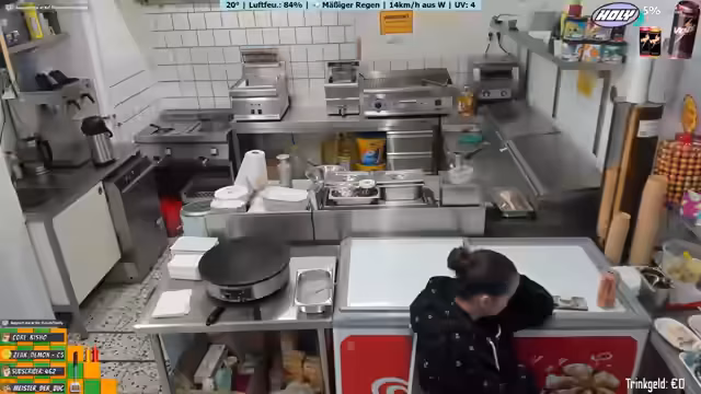 00:23:41Der Streamer zeigt und benennt die verschiedenen Geräte und Einrichtungen im Imbiss: Pommesfritteuse, Crepes station, Salatette, Toaster, Warmhalter und weitere Geräte. Er erwähnt, dass die eigentlich Boxen kaputt sind und sie daher improvisieren müssen. Arbeitskleidung wie Leggings wird getragen, da sie nach einer Operation bequemer sind als Jeans. Die Arbeitsumgebung wird als funktionell, aber etwas chaotisch beschrieben.