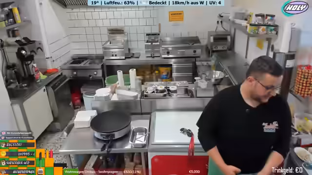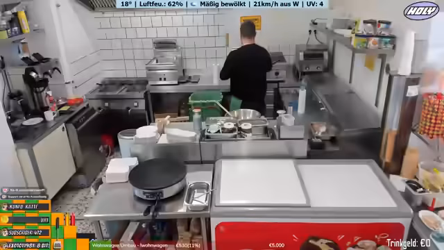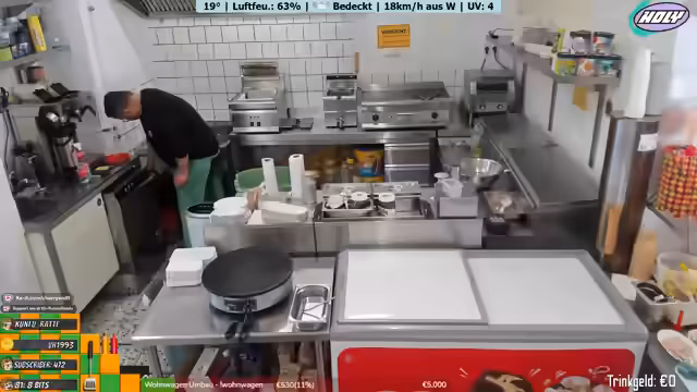 00:09:29Eine ungewöhnlich starke Regenfront führt dazu, dass selbst die Bademeisterin eine Jacke tragen muss, was für den Sommer untypisch ist. Trotz dieses schlechten Wetters fühlt sich der/die Streamer/in gut und voller Tatendrang. Während des_streams werden verschiedene anstehende Aufgaben wie das Auffüllen des Imbisses, die Vorbereitung von Grillgerät und das Servieren von Pommes und Currywurst erwähnt, wobei der/die Streamer/in stets für die persönliche Betreuung der Gäste sorgt und mit viel Engagement agiert.