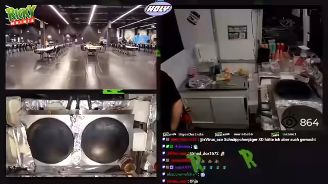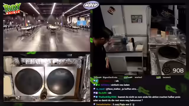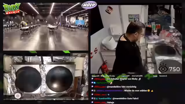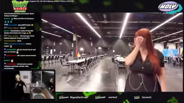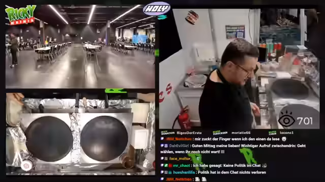 00:02:02Der Streamer interagiert kontinuierlich mit den Besuchern am Stand, nimmt Bestellungen auf und leitet die Kunden an seine Kollegin weiter. Es kommt immer wieder zu kleinen technischen Pannen, wie zum Beispiel einem Ausfall der Anlage oder Probleme mit dem Teig für die Crêpes. Auch die Internetverbindung ist gelegentlich instabil, was der Streamer den Zuschauern mitteilt und sie bittet, sich nicht zu wundern, falls der Stream kurz ausfällt.