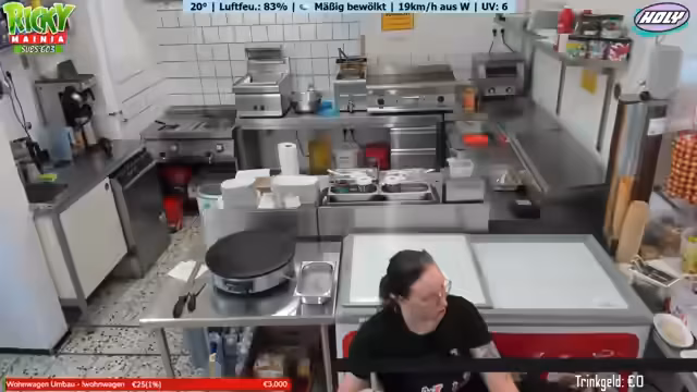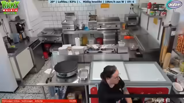 00:08:09Der Fokus verschiebt sich auf den laufenden Imbissbetrieb. Es gibt Waffeln in den Sorten Vanille und Strazaterna, während beim Crepe verschiedene Toppings wie Zucker, Zimt, Apfelmus, Nutella und Joghurt zur Auswahl stehen. Auch Kaffee und Softdrinks werden serviert. Das Personal ist mit der Ausgabe beschäftigt, wobei einige Kunden wiederholt bestellen und bekannte Gesichter wie Günni auftauchen. Es gibt auch Hinweise auf eine WG-Situation, in der ein Mitbewohner namens Damon für Unmut sorgt.