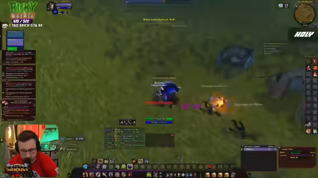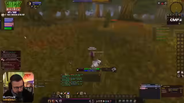 03:15:04Die Gruppe jagt den Mob Hogger in Elwynn Forest. Es kommt zu Verwirrung über seine Position, was zu einem unkoordinierten Angriff und einem Risiko, weitere Mobs zu pullen, führt. Der Streamer äußert Frustration über den Tod seines Priesters in der Vergangenheit, was ihm noch in der Seele weh tut. Er erwähnt seinen spekulativen Versuch, für den Rest des Streams als "Sauerkraut" fortzufahren, was auf eine humorvolle Selbstidentifizierung hindeutet.