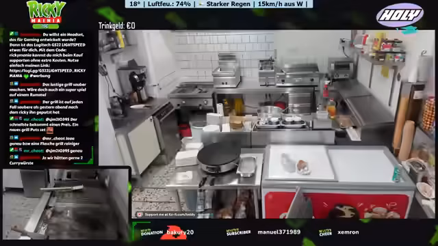 04:05:40Der Streamer beklagt das schlechte Wetter mit starkem Regen und Gewitter, was die Arbeitsbedingungen beeinträchtigt. Er diskutiert mit dem Chat über Essensvorlieben und gibt seine Top 3 Pizza-Kombinationen an: klassische Schinkenpizza, Hawaii-Pizza mit Mais und eine Pizza mit Hähnchen, Brokkoli und Hollandaisesauce. Er zeigt sich erfreut über Gleichgesinnte, die Hawaii-Pizza mögen.