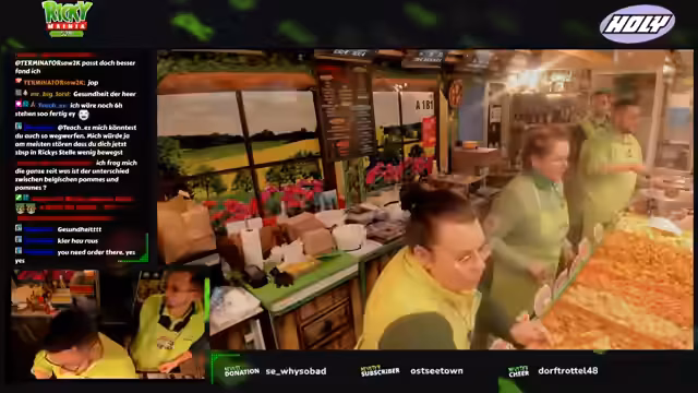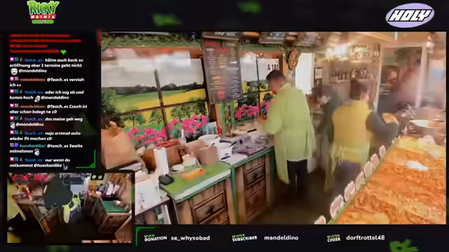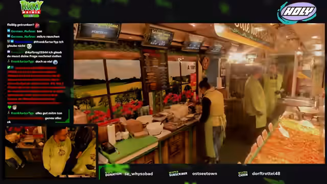 01:42:34Der Arbeitsalltag am Stand ist geprägt von ständiger Organisation und Interaktion. Der Streamer ruft Bestellungen laut durch, kommuniziert mit seinem Kollegen 'Berni' und holt Chips bei den Kunden ab. Er zeigt sich sichtlich erschöpft und erwähnt seinen körperlichen Zustand, der durch den Stress und den Sportkurs verursacht ist. Gleichzeitig bleibt die Stimmung durch den regen Chatverkehr und die humorvollen Anekdoten, wie über den Zuschauer Ronny, lebhaft.