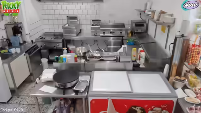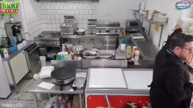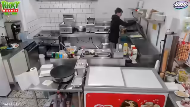 08:04:32Es werden verschiedene Speisen angeboten, darunter Pommes, Nuggets, Burger, Crepes und Eiskreationen. Die Zubereitung erfolgt sorgfältig, bei Pommes wird beispielsweise darauf geachtet, diese in der Schale anzurichten, um eine größere Menge zu suggerieren. Für die Saucen wie Ketchup oder Mayo werden separate Behälter verwendet und gereinigt. Die Preise für die Speisen variieren, ein Burger beispielsweise kostet 7 Euro.