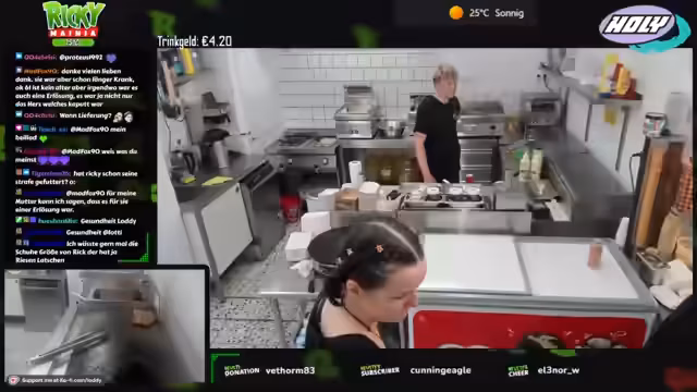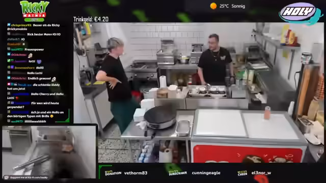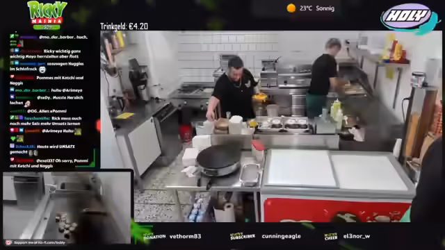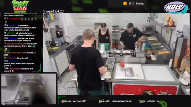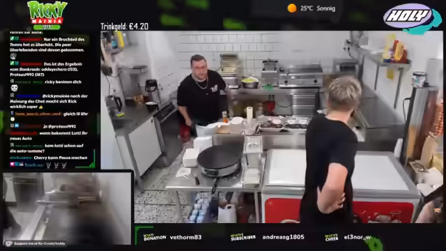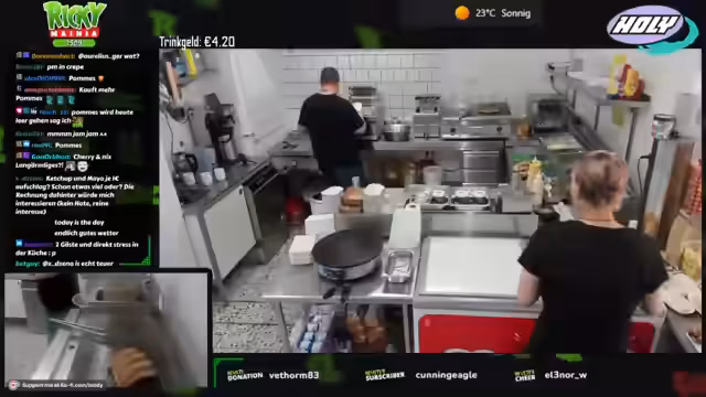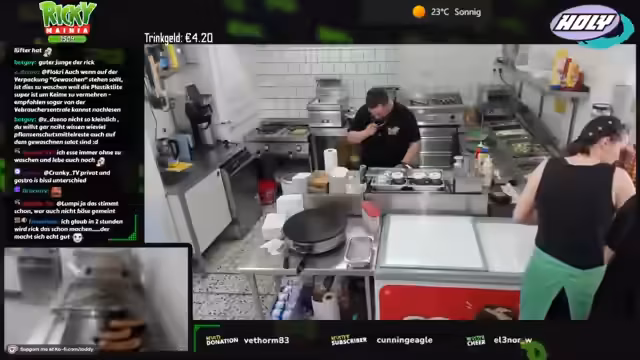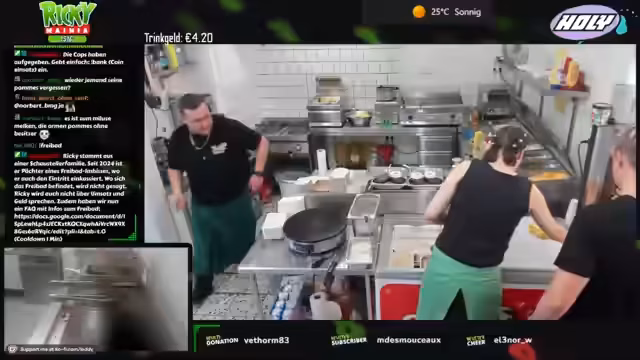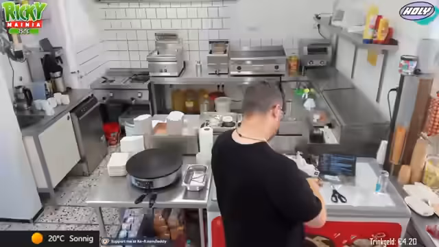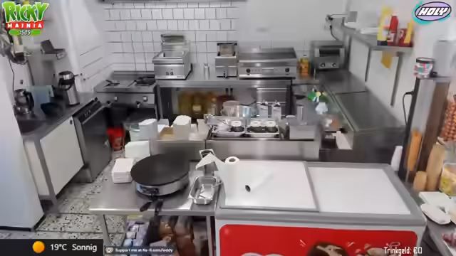 00:12:22Zu Streambeginn wurden anhaltende technische Probleme sowie eine späte Anreise nach der Fritteusen-Reparatur und Fettwechsel-Aktion thematisiert. Trotz handwerklicher 'Macken' wurde die Einsatzfähigkeit aller Geräte sichergestellt. Die Vorräte, inklusive 100 Kilo Pommes, wurden vollständig aufgefüllt und die Sauberkeit der Arbeitsbereiche gewährleistet. Um den erwarteten Andrang bei 28 Grad zu bewältigen, wurde eine personelle Umstellung notwendig.