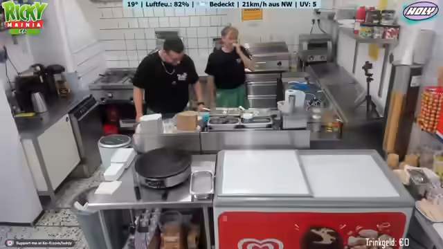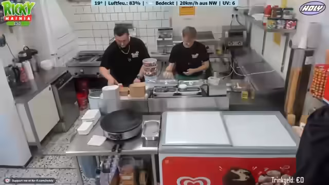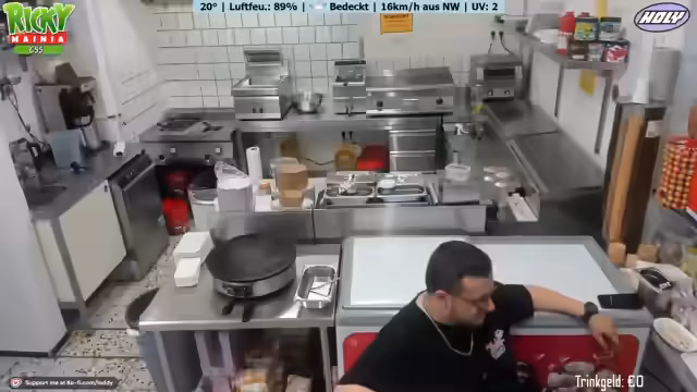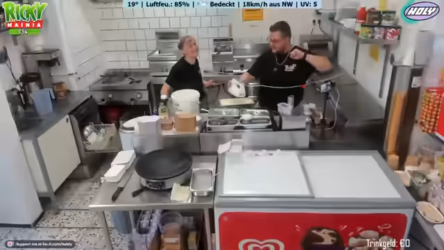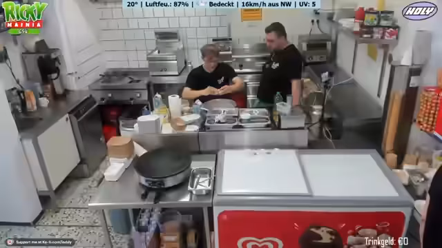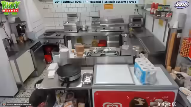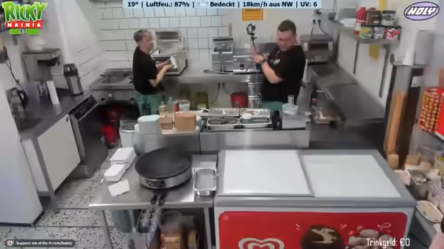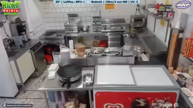 02:00:44Der Stream beginnt mit dem gemeinsamen Auftreten von Ricky und Johnsman. Johnsman, der als Praktikant im Kiosk hilft, wird von Ricky eingeweiht. Gemeinsam bereiten sie die Verkaufsfläche vor. Johnsman wird für seine erste Aufgabe, die Zubereitung einer Bratwurst, aufgefordert. Die Zubereitung erfolgt unkonventionell auf einem Pappteller ohne Brötchen oder Soßen, wie es im Norden üblich sei. Unmittelbar danach folgt die erste Kundschaft, die eine Vanilleeiskugel in einer Waffel bestellt, die Johnsman erfolgreich bedient.