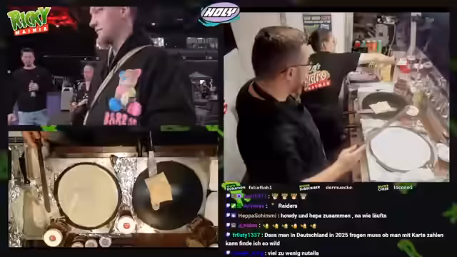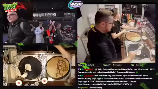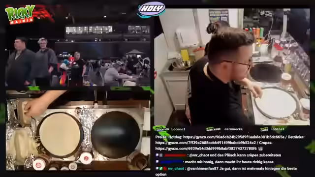 00:20:36Der Streamer startet mit dem Verkauf von Crêpes und Hot-Dogs und informiert über die Preise: Ein Crêpe kostet 6 Euro, ein Hot-Dog 8 Euro. Er bietet verschiedene Beläge an, darunter Apfelmus, Nutella, Zimtzucker, Bananen und Käse. Der Streamer interagiert häufig mit den Kunden, fragt nach ihren Wünschen und gibt Bestätigungen durch Jawohl. Während des Verkaufs erwähnt er auch, dass es später im Abend möglich sein wird, Crêpe-Teig abzuholen, falls noch übrig bleibt. Die Atmosphäre ist entspannt und der Streamer ist bemüht, die Kunden gut zu bedienen und gleichzeitig den Chat zu unterhalten.