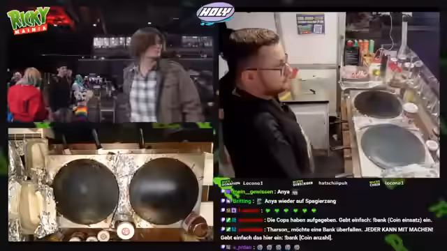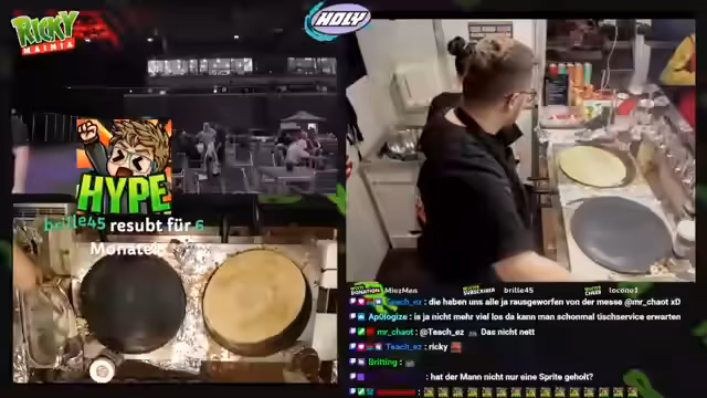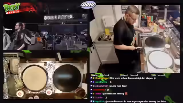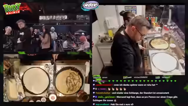 00:15:00Der Stream beginnt mit Begrüßungen des Chats und ersten Vorbereitungen für den Verkauf von Crêpes und Hot-Dogs. Der Streamer sucht nach Wasser und erwähnt, dass Jackbox-Spiele gespielt werden können, wenn man das Spiel besitzt. Es werden technische Geräte wie Boxen getauscht, was auf eine spontane Vorbereitung hindeutet. Der Streamer kommentiert auch verschiedene Chatinteraktionen und Resubs, die während der Vorbereitungen stattfinden, und beginnt mit der Zubereitung von Apfelmus und Bananen für die Crêpes. Der Stream wirkt vorbereitet und es werden verschiedene Interaktionen mit dem Chat gepflegt, wobei der Streamer seine Zuschauer aktiv einbindet.