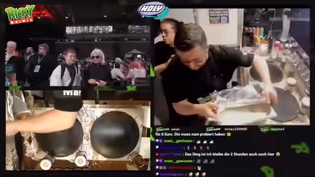 00:45:38Während des Streams besucht Maskottchen Maxi (das Maskottchen der Messe) den Stand und begrüßt die Zuschauer. Der Streamer nutzt die Gelegenheit, um eine Zuschauerin in einem kurzen Workshop das 制作 von Crêpes beizubringen. Er erklärt Schritt für Schritt, wie man den Teig auf die Platte gibt, verteilt und mit einer Kelle belegt, bevor er den fertigen Crêpe zeigt. Die Zuschauerin ist begeistert und bedankt sich. Dieser Abschnitt zeigt nicht nur die Interaktion mit der Messe und ihren Maskottchen, sondern auch die Bereitschaft des Streamers, sein Wissen weiterzugeben und die Zuschauer aktiv am Geschehen teilhaben zu lassen.